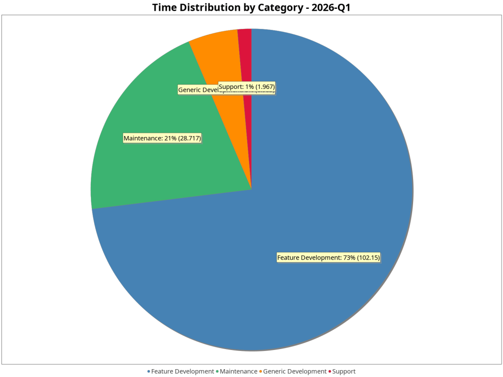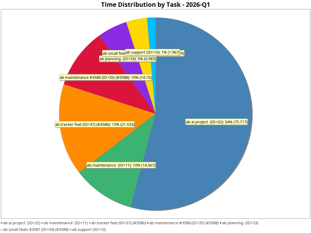 This work came at a cost: the AI project consumed 75.72 hours this quarter (101.69 hours total since Q4 2025), and since there is no dedicated feature sponsorship for it, all of that was drawn from the generic development pool. As a result, the generic pool accumulated 43.23 hours of free (unsponsored) work over the quarter, meaning roughly 43 hours (~2,810 €) of the AI work was effectively self-sponsored. The detailed sponsorship data below tells the full story, but in short: community sponsorship doesn’t come close to covering this implementation in full. That said, I consider this a worthwhile investment — the feature is genuinely exciting and I believe it will be a valuable addition for users.