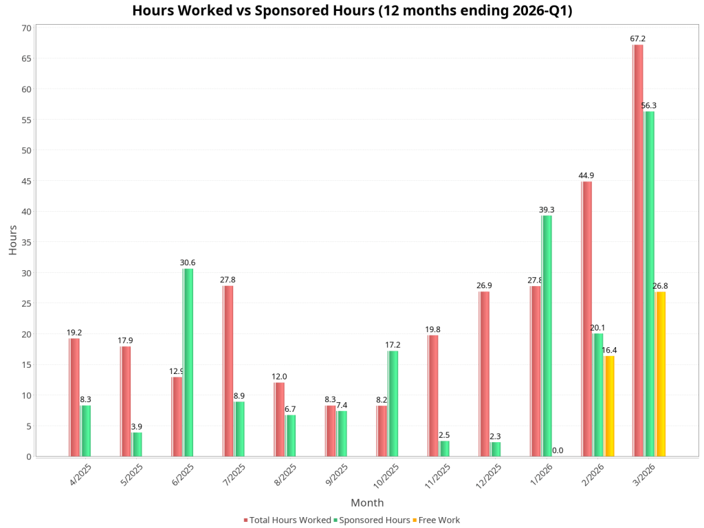 Support, issues, and pull requests. One area that suffered this quarter was user support and issue triage. After January, support work dropped to just 1.97 hours for the entire quarter, and I have not been reading through open issues except those directly related to the AI project and the sponsored tracker feature. This is something I need to address going forward. On the pull request side, we’ve seen an increase in community-contributed pull requests — likely driven by the growing use of AI coding assistants. I have not had time to properly review most of them. A refined contribution policy is under development to ensure that high-quality contributions make it into the codebase efficiently, while avoiding spending disproportionate review time on lower-quality AI-generated submissions.